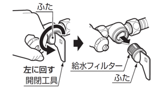 2.給水フィルターのふたを開閉工具で開けて、給水フィルターを取り出す。