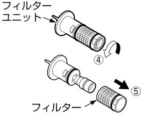 5.フィルターユニットを左(反時計まわり)に約90°回して引き抜きます。