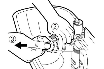 2. フィルターは給水管とタンクの接続部にあります。タンクのふたを開け、ボールタップがタンク内に落ちないよう保持しながら、袋ナットをモンキーレンチで左(反時計まわり)にまわし、取り外します。