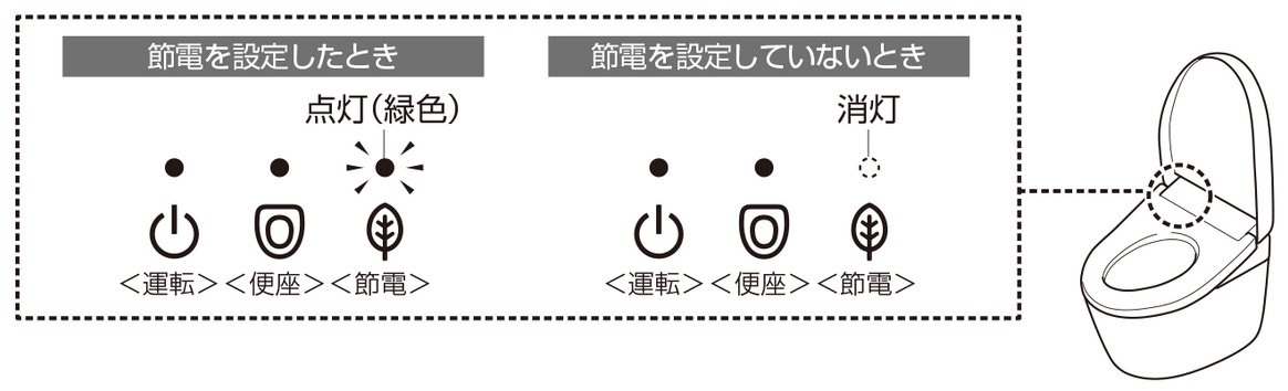 ウォシュレット本体表示部の「節電」ランプが点灯、「運転」ランプが消灯している場合は、節電機能がはたらいている最中です。