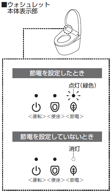 ウォシュレット本体表示部の「節電」ランプが点灯、「運転」ランプが消灯している場合は、節電機能がはたらいている最中です。