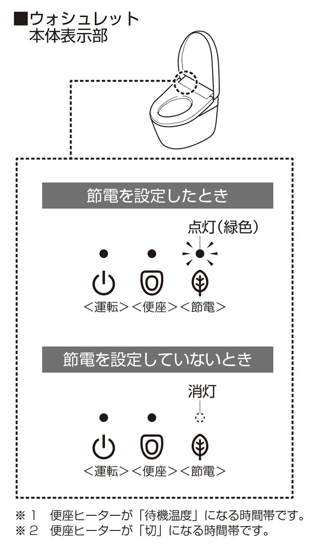 ウォシュレット本体表示部の「節電」ランプが点灯、「運転」ランプが消灯している場合は、節電機能がはたらいている最中です。
