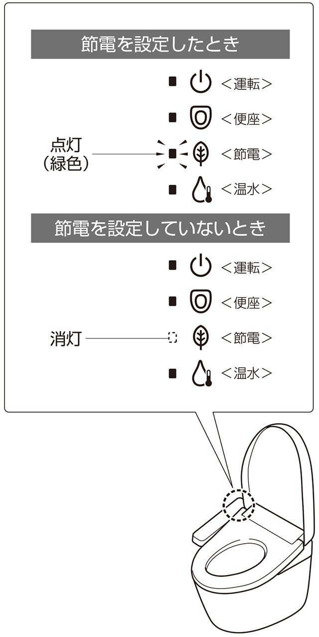 ウォシュレット本体表示部の「節電」ランプが点灯、「運転」ランプが消灯している場合は、節電機能がはたらいている最中です。