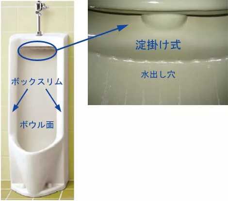 淀掛け式は、リム形状がボックスタイプで、洗浄水がボウル面およびボックスリム内に流れ洗浄します。