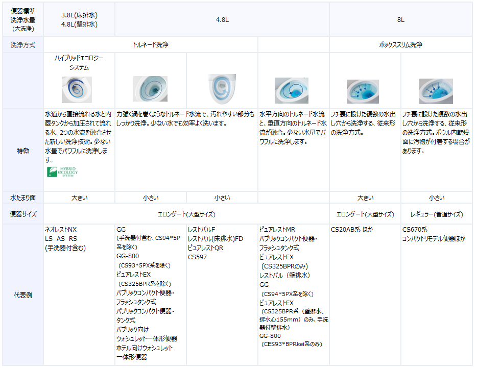 | 普通便座 特別な機能の付いていない、ごく一般的な便座です。 | 暖房便座 座る部分にヒーターが入っているので、冬でも快適に使えます。 | 温水洗浄便座 ウォシュレットのこと。おしり洗浄、ビデ洗浄、暖房便座の3つの機能を標準装備。乾燥、脱臭などを加えたタイプもあります。 |