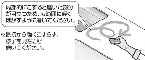 メラミンスポンジに水を付け、軽くこするように磨くまたは、柔らかい布にアルコール(エタノール)を付けてふき取る。