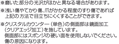 ※クリスタルカウンター上に残る水滴が気になる場合は「マイクロファイバークロス」のご使用をおすすめします。