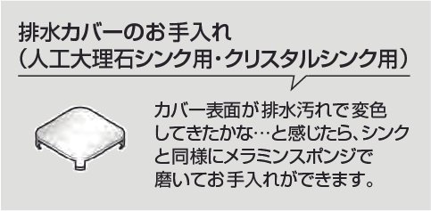 | 日ごろのお手入れ (全素材に共通) | 汚れたとき (全素材に共通) | さらにひどい汚れ | 深い傷・欠け (人工大理石・クリスタル) |
