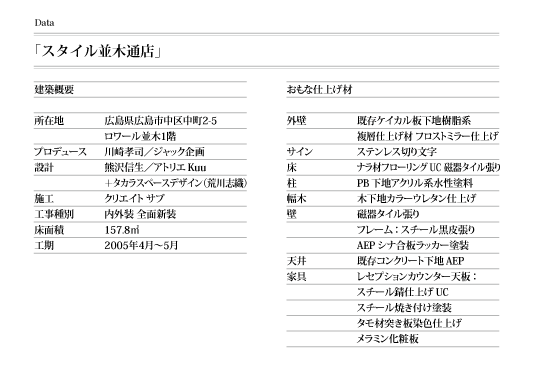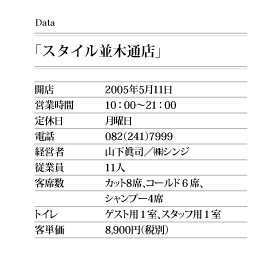最初に訪れた「スタイル並木通店」はスペースプロデューサーであるジャック企画・川崎孝司さんと共同作業の美容室。熊沢さんがまだタカラスペースデザインで仕事をしていた頃からの付き合い。ふたりがまず語ったことは「スタッフにいかにして楽しく働いてもらうか」ということ。これにつきると。これはその後に訪れた「ウィスタリアフィールド」のオーナー藤田善洋さんもまったく同じ発言をしている。
