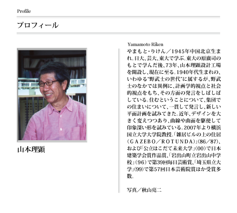 山本は、建物の設計にあたり、社会性、公共性を重視することで知られ、コンペのときなど、この面への配慮に欠ける若い人に苦言を呈する。集合住宅はことさらで、社会と家族のあり方から発想を進め、その結果、当然のようにまず平面が固まり、つづいて立面に向かう。