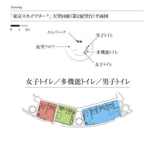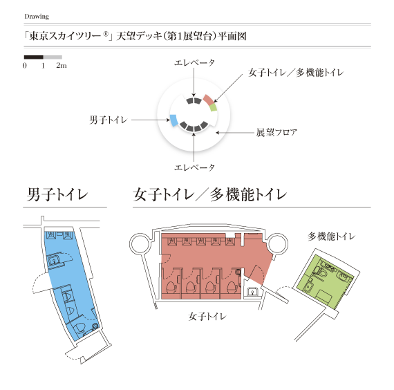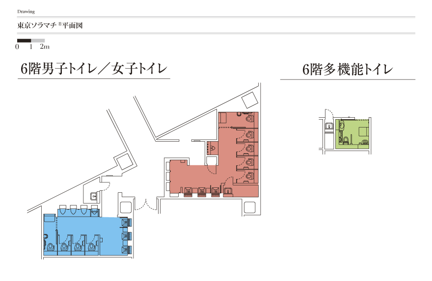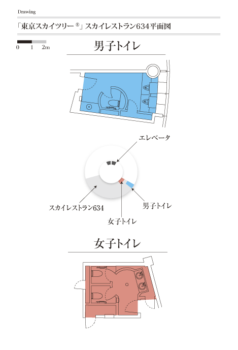 最後に、「東京ソラマチ®」のトイレを見学した。全長400mにもおよぶ商業施設だけに、トイレを分散して配置する必要があり、全部で26のトイレを設けたとのこと。撮影した6階レストラン街には3カ所にトイレがあり、うちメインエレベータのそばには多機能トイレもある。