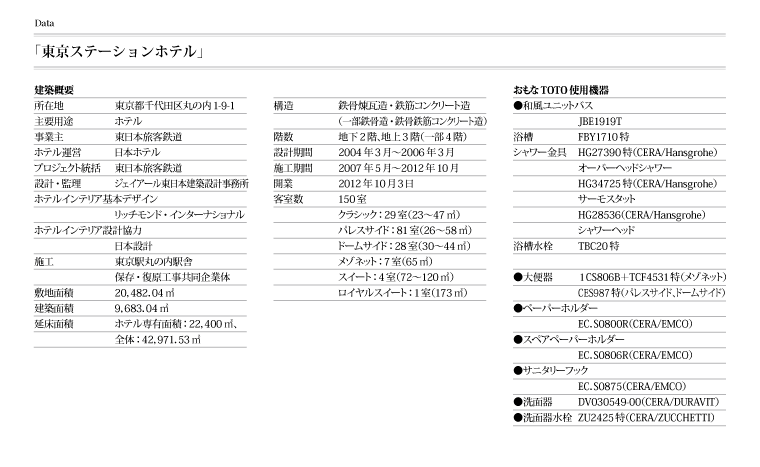 ロビーに一歩入ると、外観のイメージを裏切らないヨーロピアン・クラシックのインテリアが広がるが、東京ステーションホテルの茶谷譲介さんによれば、当初は内部をモダンデザインにしたらどうかという意見もあったそうだ。確かに、ヨーロッパでは歴史的建造物の内部にモダンなホテル空間が潜む例も珍しくないが、はたして赤煉瓦の古い建物自体が珍しい日本で、あえて外と中を対比させ意表を突く必要があるのか。検討を重ねる一方、顧客対象のアンケート調査を実施したところ、外観になじむクラシックな内装を期待する声が多数を占めた。この結果もあり、最終的にクラシック様式に落ち着いたという。