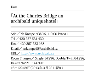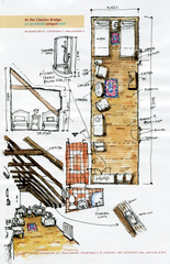 その橋のたもと、左岸のカンパ島にあるホテル。改装と聞いてチェック・イン。赤瓦、濃い黄色に塗った外壁、質素でコンパクトな4階建てのとてもリーズナブルな価格のエコノミーホテル。その最上階の屋根裏部屋は小屋裏があらわし。屋根を支える登り梁に、したたかに頭を打った。そして恐ろしく長い平面。9300㎜もあり、一番奥にベッドがある。ドーマー(*1)がふたつあるだけ。なんとなく寂しく、長逗留ではないのだがちょっとした小公女(*2)気分を味わえる。バスルームにはバスタブがなくて市販のシャワーユニットが置いてあるだけ。