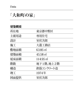 70年代の都市住宅といえば、内向きに閉じて内部に小宇宙をつくるという自閉型が常套手段であったが、室伏はそうした一連の建築家住宅がもつ、街に対する閉鎖的な表情に疑問を感じていたという。そこで、いったん街に大きく開いた外郭をつくり、その内部に厚い壁で囲われた空間をつくるという逆の手法を編み出したのである。ここでは、角地に立つ家の南を走る通りが主要道路であるため、そこから内部空間を守るべく、長手方向に沿って壁を襞(ひだ)のように連続させて立てたわけだ。