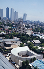 その第1は外部。高さ4.5mのコンクリート打放しの壁面がそそり立っている。開口部はほとんど見当たらないし、中をうかがい知る手がかりもない。極端なまでの閉鎖性。都会の住宅地の真ん中に出現した要塞としか見えない。そのたたずまいは威容であり、異様でもある。