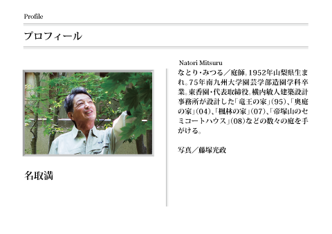 横内さんと私の庭のつくり方は、雑木を用い、自然でやさしい感じの線を出すなど、似ているところが多くあります。手本はやはり京都です。先生の場合は庭だけでなく、建築もさらっとやさしいですね。