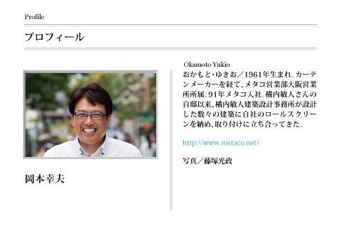 あらためて考えたら、1軒に数本は取り付けるので、すでに延べ500~600本は納めています。先日、横内さんの事務所の所員の方と話していたら、若い所員が知らない現場も僕が知ってるので、「岡本さん、全物件知ってるんちゃう? 横内事務所の生き字引やね」と言われ、自分でもすごいなと思いました(笑)。