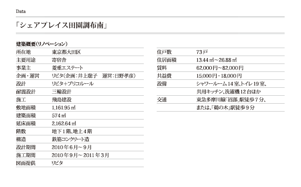 シェアプレイスとは、おもに住宅のリノベーション事業を手がけるリビタが展開中のシェア型賃貸住宅のブランド名で、最近では新築タイプも登場している。通常のシェアハウスと比べると、総戸数が数十戸という大型のものが主流。「シェアプレイス田園調布南」は築43年の独身寮を全面改修したもので、事業主は三菱重工のグループ会社である菱重エステート。リビタは同社と提携し、企画・設計・運営を行っている。建物は鉄筋コンクリート造地上4階、地下1階建てで、総戸数は73戸。入居者は20代後半~30代後半の社会人が中心。男女比は4対6で、女性がやや多いそうだ。