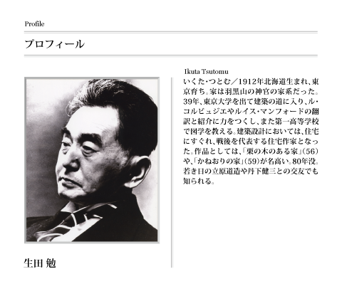 生田の作品歴を見ると、公共建築は少なく、住宅が、それも小さな独立住宅が多い。公共建築も、スケール感をわざと小さく抑えている。名作として歴史に名を残すのは「栗の木のある家」(1956)や「かねおりの家」(59)のように小さな家ばかり。
