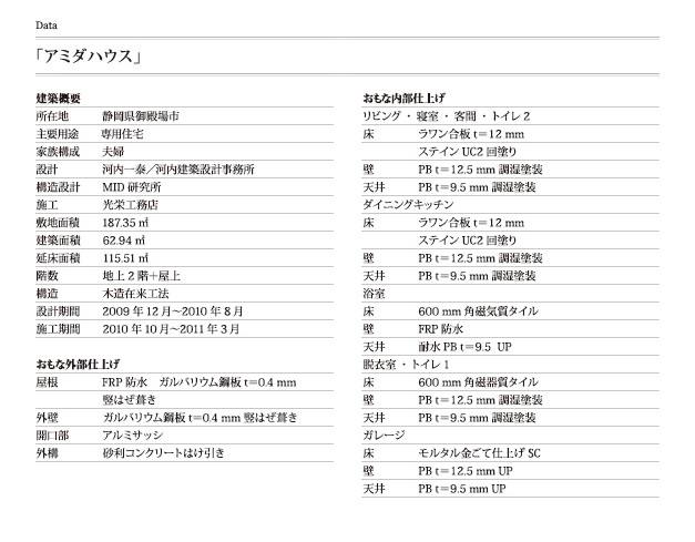 「アミダハウス」は、富士山が眼前に聳える静岡県御殿場市の住宅地にある専用住宅。四辺がほぼ東西南北を向き、北側が前面道路の四角い敷地に立っている。