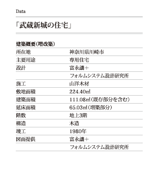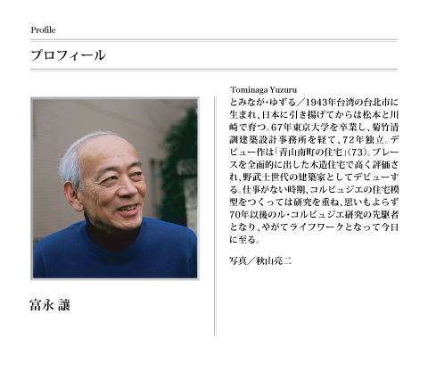 すでに、「住吉の長屋」(76/『TOTO通信』97年VOL6:原・現代住宅再見5)や「中野本町の家」(76/『TOTO通信』98年VOL3:原・現代住宅再見8「黒の回帰」文中)などで述べたように、1970年代、私たち野武士世代は、精神的にもつくる住宅も自閉していた。野武士は城に依らず野山に伏し隠れていたことから“野伏し”とも書くが、富永讓も、安藤や伊東に負けず劣らず川崎の藪のなかに伏せていたことを知り、うれしかった。