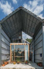 図面上ではバナキュラーな町家の構成が忠実に踏襲されているようにみえるが、実際の様相は違う。鉄骨の家型シェルターの内側に、それとは完全に縁を切って、木造軸組の箱が3つ置かれている。箱は必要に応じて大きさを違え、凸凹があって整形ではない。きれいに揃って並んでいるのではなく、面がずれ、高低が変わり、散在している状態に近い。シェルターが正確な規則性を備えているのに反して、箱は不規則で自由なリズムを刻んでいる。バナキュラーな町家が内外一体となって特定の規則的なリズムを奏でている姿とは正反対といえる。