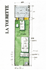 約100室の同じ形の僧坊は一部を宿泊できるようにしてある。内法5938×1834㎜の細長い平面。幅は京間の畳長さよりちょっと小さい。奥行き1495㎜のブリーズ・ソレイユ(*3)がついて、芽吹きの木々が見えるせいか意外に明るい。仏教寺院の僧坊のようなものを想像して来たのだが暗さがまったくない。何度も塗り直したような窓とドアまわりの赤、黄、緑、黒のペイントは、今やなつかしいあの色。蚊除けの金網がついて、風を通す幅265㎜の小さなドアがかわいい。