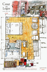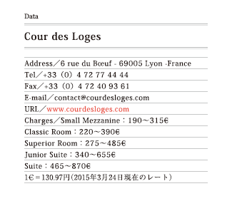 リヨン旧市街の古い古い路地に面したホテル。赤い壁のエントランス・アプローチを歩くとガラスの自動ドアが妙な音を響かせ、異次元の世界に誘うよう。ダイニングを兼ねた中庭の吹抜けまわりには濃い黄色のアーチと赤い壁の回廊。時間がゆっくりと巻き戻されるような不思議なタイム・スリップ感。