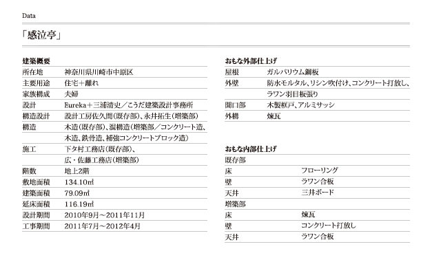 Eurekaと三浦さんが、どのように小山の息子夫婦と出会ったのかというと、じつはこちらも立原がらみ。少し詳しく説明すると、立原が生前に設計した未完の週末住宅「ヒアシンスハウス」を、埼玉県の別所沼公園に建設しようという計画があり、その委員に佐野さんと三浦さんが加わっていた。この計画は04年に実現をみたが、その後、同じ建設委員の仲間の紹介により、「感泣亭」の増築を検討していた小山の息子夫婦と知り合いになり、佐野さんと三浦さんがこれを手がけることになったそうだ。小山と生田の出会いから70年後、偶然にも、再び立原に関係して、施主と設計者につながりが生まれた。