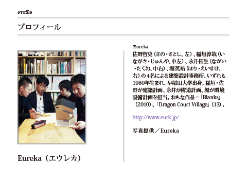 一方、2012年に主屋の改修と増築を手がけたのは、Eurekaと三浦清史さん。Eurekaというのは、意匠設計の稲垣淳哉さんと佐野哲史さんが主宰するアトリエ事務所で、構造設計の永井拓生さん、環境設備設計の堀英祐さんとパートナーシップを結ぶ、小さな組織設計体。全員、早稲田大学出身だ。一方、三浦さんも同じ大学出身の建築家だが、Eurekaの4人とは父と子くらい年齢に差がある。Eurekaにとって心強い存在である。