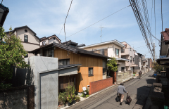 東急東横線の元住吉駅から歩くこと7分。ここは、かつて神奈川県が同潤会に建設・管理を委託し、住宅営団が引き継いだ「元住吉住宅」があった場所だ。まわりを水田に囲まれて、166戸の平屋建てが行儀よく並んでいた。今ではそのほとんどが2階建てに替わったが、「感泣亭」はちょうどその中間ほどの高さ。2階建てながら、屋根をぐっと低く抑え、こぢんまりとしたたたずまいを見せている。